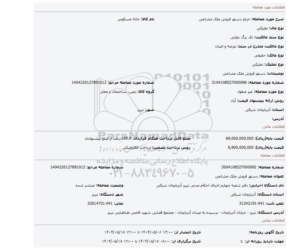9 مزایده دستور فروش ملک مشاعی 9810687 1404/08/15 new not special not payed آذربایجان شرقی
