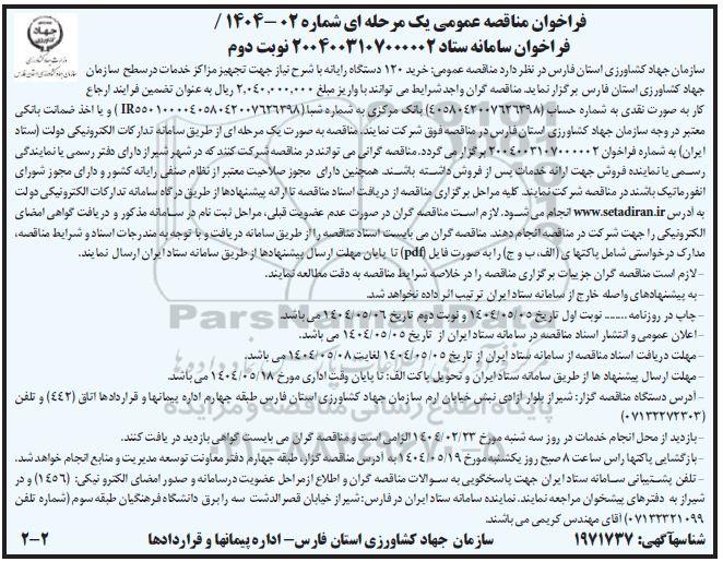 سازمان جهاد کشاورزی استان فارس در نظر دارد مناقصه عمومی خرید 120 دستگاه رایانه با شرح نیاز جهت تجهیز مراکز خدمات در سطح سازمان جهاد