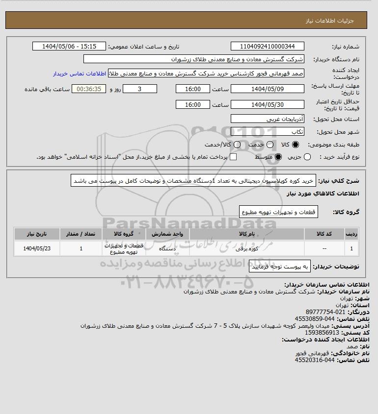 نام دستگاه خریدار:شرکت گسترش معادن و صنایع معدنی طلای زرشوران
