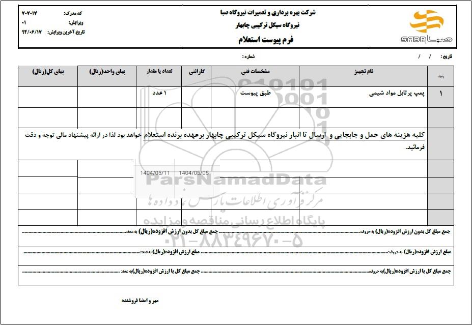 استعلام بها و موضوع استعلام استعلام پمپ پرتابل مواد شیمی به اطلاع کلیه شرکتها و افراد متخصص واجد شرایط میرساند، آگهی گذار در نظر دارد از طریق استعلام بها، نسبت به انتخاب و دریافت پیشنهادات اقدام نماید. این استعلام با کد آگهی ثبت شده در سامانه خبرگزاری پارس نماد : 9333904 منتشر شده است. مشخصات استعلام : تاریخ شروع استعلام: 1404/05/06 آخرین مهلت ارسال پیشنهاد قیمت : 1404/05/11 و محل اجرای پروژه : استان سیستان و بلوچستان میباشد. استعلام قیمت مورد درخواست : استعلام پمپ پرتابل مواد شیمی با دستهبندیهای تخصصی و گروه های مرتبط : الکتروموتور و پمپ های شناور, نیروگاه, تجهیزات برق و الکترونیک, استعلام اطلاع رسانی میگردد. شرایط شرکت در استعلام آنلاین : ابتدا ثبت نام در سامانه استعلام پارس نماد و تکمیل مدارک موردنیاز و بارگذاری در سامانه رعایت تمامی ضوابط و الزامات مندرج در اسناد استعلام است.