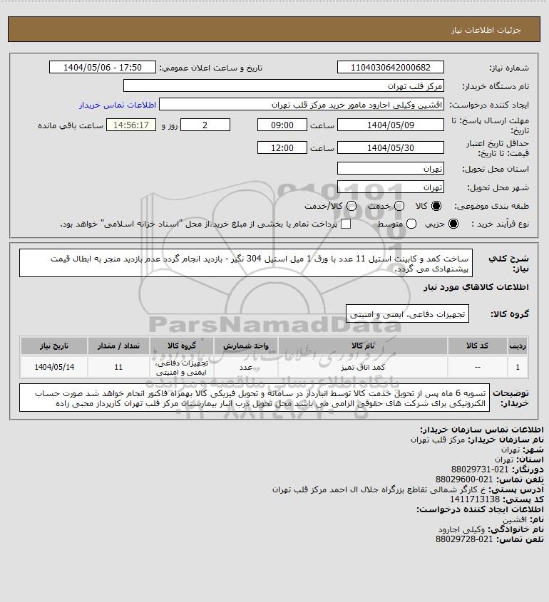 شرح کلی نیاز: ساخت کمد و کابینت استیل 11 عدد با ورق 1 میل استیل 304 نگیر - بازدید انجام گردد عدم بازدید منجر به ابطال قیمت پیشنهادی می گردد.
