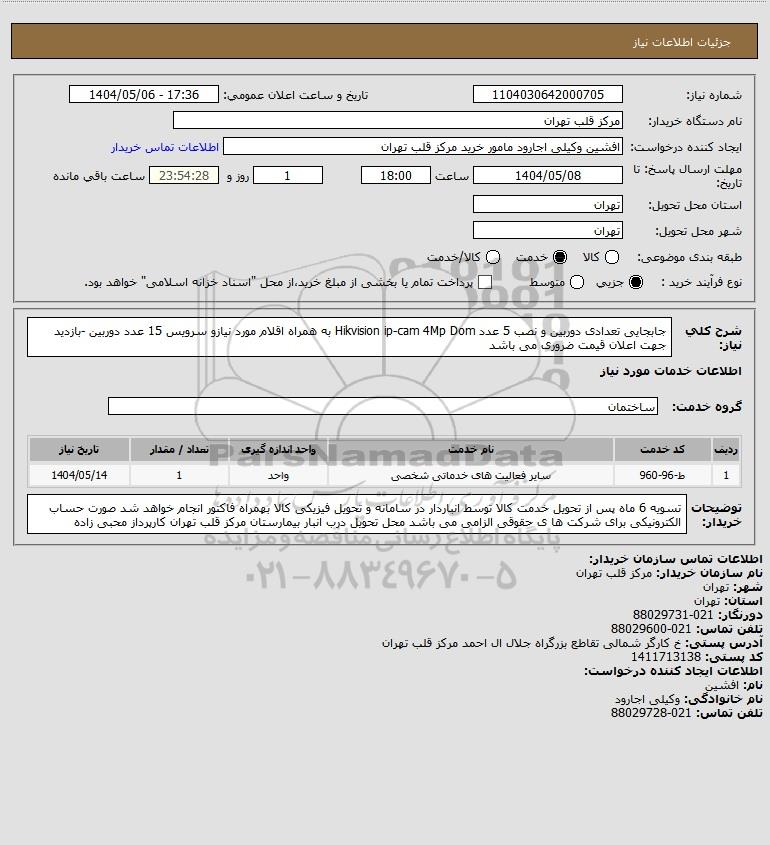 استعلام بها و موضوع استعلام استعلام جابجایی تعدادی دوربین و نصب 5 عدد Hikvision ip-cam 4Mp Dom به همراه اقلام مورد نیازو سرویس 15 عدد دوربین -بازدید جهت اعلان قیمت ضروری می باشد به اطلاع کلیه شرکتها و افراد متخصص واجد شرایط میرساند، آگهی گذار در نظر دارد از طریق استعلام بها، نسبت به انتخاب و دریافت پیشنهادات اقدام نماید. این استعلام با کد آگهی ثبت شده در سامانه خبرگزاری پارس نماد : 9334108 منتشر شده است. مشخصات استعلام : تاریخ شروع استعلام: 1404/05/06 آخرین مهلت ارسال پیشنهاد قیمت : 1404/05/08 و محل اجرای پروژه : استان تهران میباشد. استعلام قیمت مورد درخواست : استعلام جابجایی تعدادی دوربین و نصب 5 عدد Hikvision ip-cam 4Mp Dom به همراه اقلام مورد نیازو سرویس 15 عدد دوربین -بازدید جهت اعلان قیمت ضروری می باشد با دستهبندیهای تخصصی و گروه های مرتبط : سیستم های حفاظتی-دوربین مدار بسته،دزدگیر،آیفون تصویری و آنتن مرکزی, استعلام اطلاع رسانی میگردد.