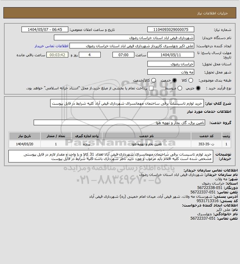 شرح کلی نیاز: خرید لوازم تاسیسات برقی ساختمان مهمانسرای شهرداری فیض آباد