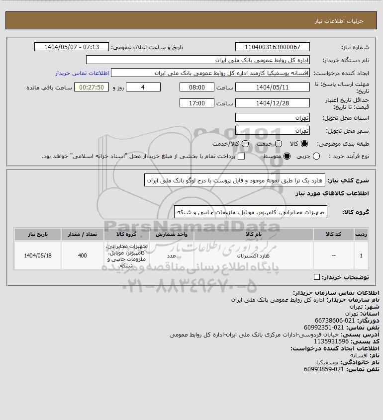 استعلام هارد یک ترا طبق نمونه موجود و فایل پیوست با درج لوگو بانک ملی ایران, استعلام هارد یک ترا طبق نمونه موجود و فایل پیوست با درج لوگو بانک ملی ایران