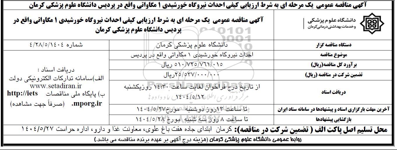 آگهی مناقصه عمومی یک مرحله ای به شرط ارزیابی کیفی احداث نیروگاه خورشیدی 1 مگاواتی واقع در پردیس دانشگاه علوم پزشکی کرمان