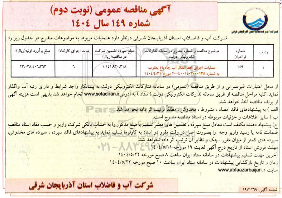 | 1 | 149 | عملیات اجرای خط انتقال آب چاه باغ یعقوب به شماره 2004001403000135 مورخ 1404.4.31 | 1.151.920.318 | 23.038.406.363 |