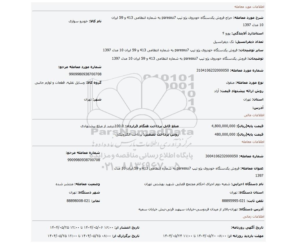 | شماره مورد معامله: 3104106232000050 | شماره مورد معامله مرجع: 9909980938700708 | |