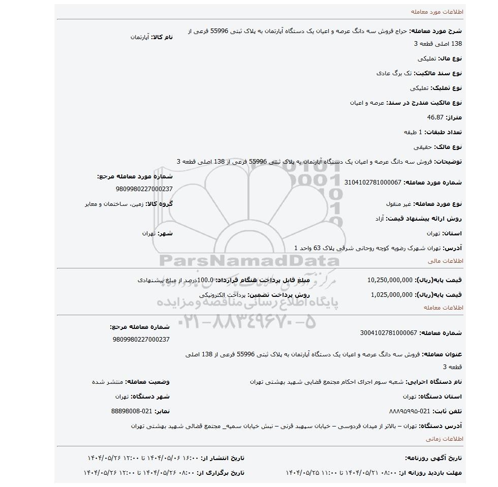 | عنوان معامله: فروش سه دانگ عرصه و اعیان یک دستگاه آپارتمان به پلاک ثبتی 55996 فرعی از 138 اصلی قطعه 3 | ||