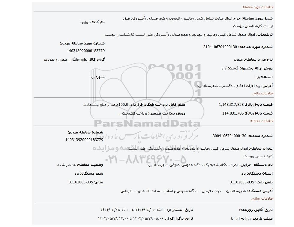 مزایده، اموال منقول شامل کیس ومانیتور و تلویزیون و هودوصندلی وآبسردکن طبق لیست کارشناسی پیوست