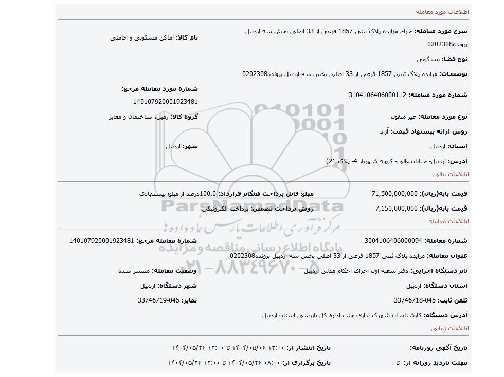 مزایده، مزایده پلاک ثبتی 1857 فرعی از 33 اصلی بخش سه اردبیل پرونده0202308