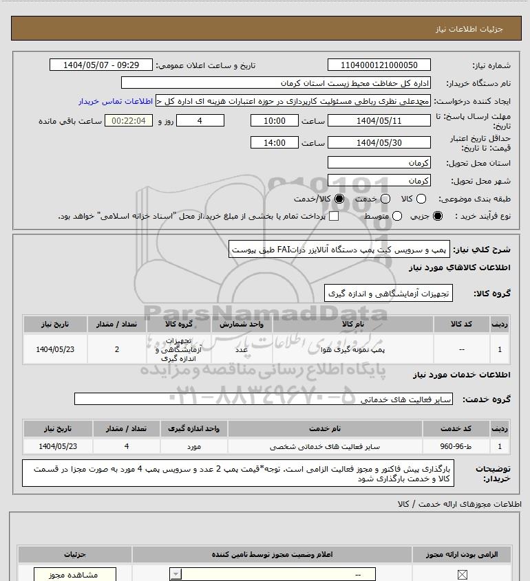 شرح کلی نیاز: پمپ و سرویس کیت پمپ دستگاه آنالایزر ذراتFAI طبق پیوست