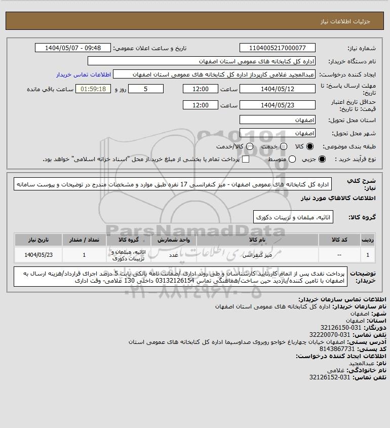 شرح کلی نیاز: اداره کل کتابخانه های عمومی اصفهان - میز کنفرانسی 17 نفره طبق موارد و مشخصات مندرج در توضیحات و پیوست سامانه