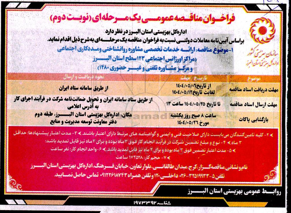 موضوع مناقصه: ارائه خدمات تخصصی مشاوره روانشناختی و مددکاری اجتماعی (مراکز اورژانس اجتماعی 123 سطح استان البرز و مرکز مشاوره تلفنی و غیرحضوری 1480)