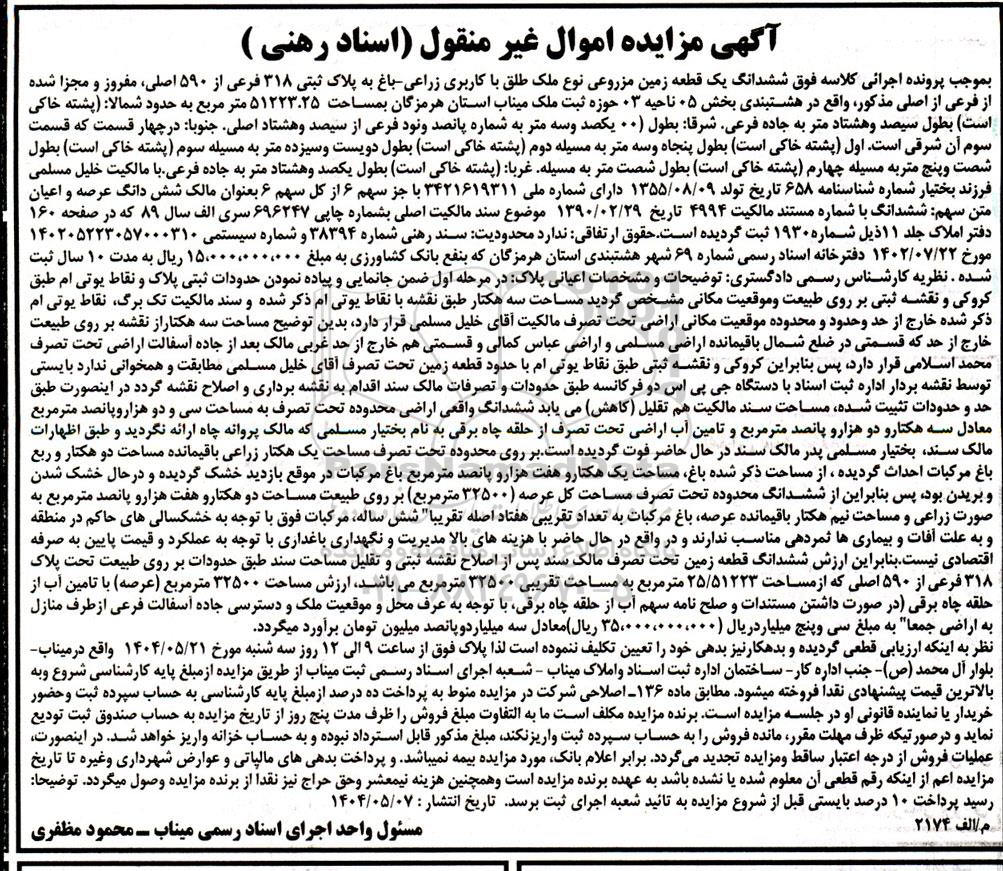مزایده فروش یک قطعه زمین مزروعی با کاربری زراعی - باغی به پلاک ثبتی 318 فرعی از 590 اصلی