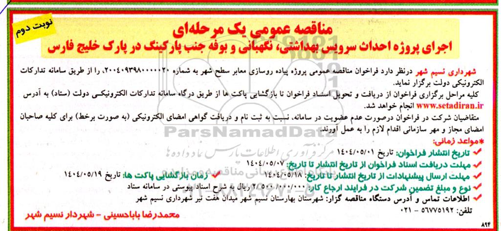 شهرداری نسیم شهر در نظر دارد فراخوان مناقصه عمومی پروژه پیاده روسازی معابر سطح شهر به شماره 2004093980000020 را از طریق سامانه تدارکات الکترونیکی دولت برگزار نماید. کلیه مراحل برگزاری فراخوان از دریافت و تحویل استاد فراخوان تا بازگشایی پاکتها از طریق درگاه سامانه تدارکات الکترونیکی دولت استاد ایران انجام خواهد شد. متقاضیان شرکت در فراخوان در صورت عدم عضویت در سامانه نسبت به ثبت نام و دریافت گواهی امضای الکترونیکی به صورت برخط برای کلیه صاحبان امضایمجاز و مهر سازمانی اقدام لازم را به عمل آورند.