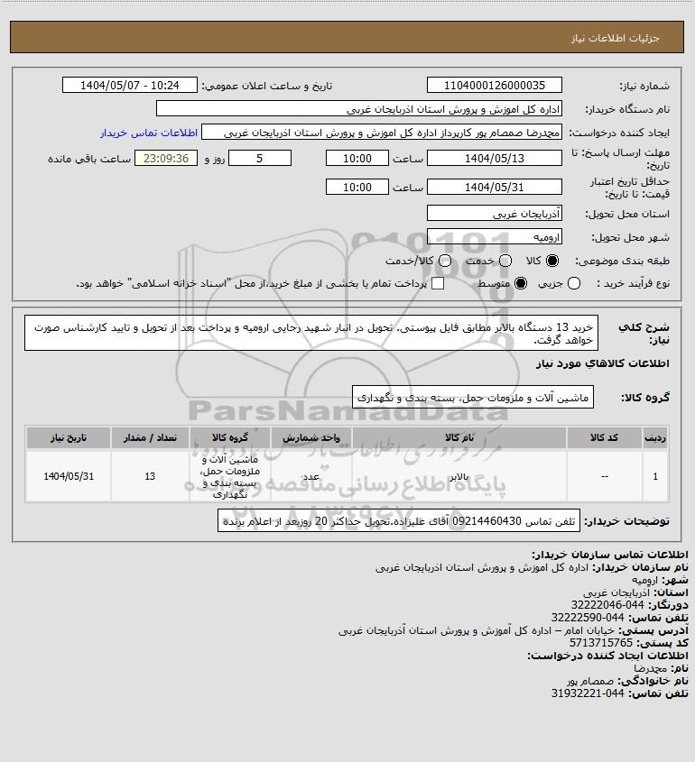 شرح کلی نیاز: خرید 13 دستگاه بالابر مطابق فایل پیوستی. تحویل در انبار شهید رجایی ارومیه و پرداخت بعد از تحویل و تایید کارشناس صورت خواهد گرفت.