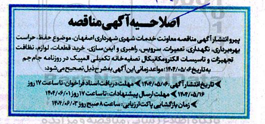 پیرو انتشار آگهی مناقصه معاونت خدمات شهری شهرداری اصفهان، موضوع حفظ، حراست، بهره برداری، نگهداری، تعمیرات، سرویس، راهبری و ایمن سازی، خرید قطعات، لوازم نظافت، تجهیزات و تاسیسات الکترومکانیکال تصفیه خانه تکمیلی المپیک در روزنامه جام جم به تاریخ 1404.05.06 مواعد زمانی این آگهی به شرح ذیل تصحیح می شود: