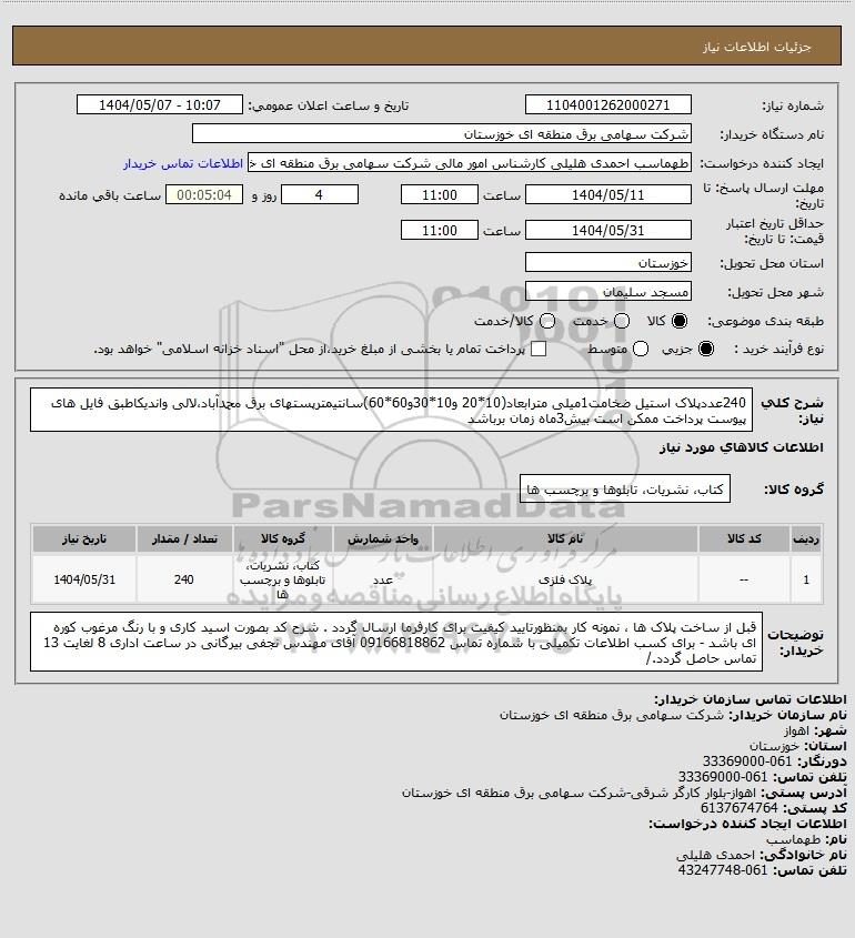 شرح کلی نیاز: 240عددپلاک استیل ضخامت1میلی مترابعاد(10*20 و10*30و60*60)سانتیمترپستهای برق محمدآباد،لالی واندیکاطبق فایل های پیوست پرداخت ممکن است بیش3ماه زمان برباشد