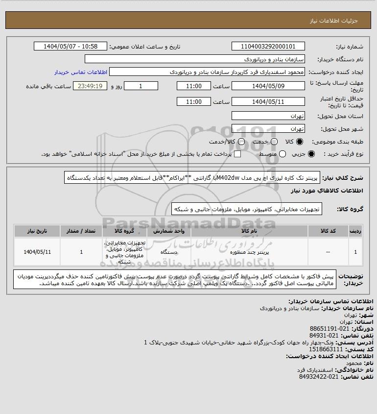 شرح کلی نیاز: پرینتر تک کاره لیزری اچ پی مدل M402dwبا گارانتی **ایراکام**قابل استعلام ومعتبر به تعداد یکدستگاه