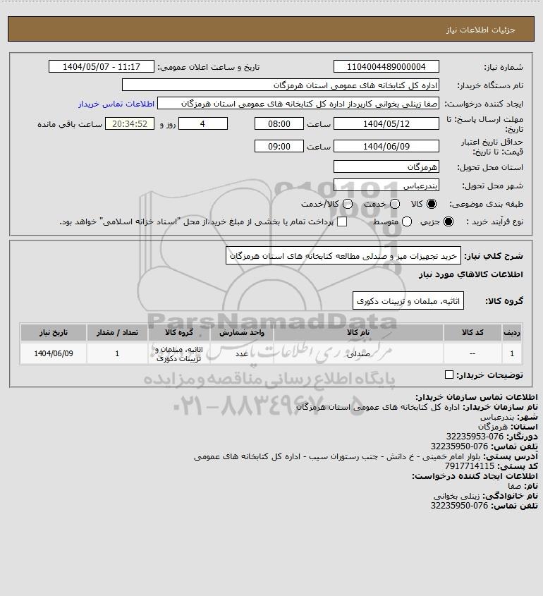 شرح کلی نیاز: خرید تجهیزات میز و صندلی مطالعه کتابخانه های استان هرمزگان