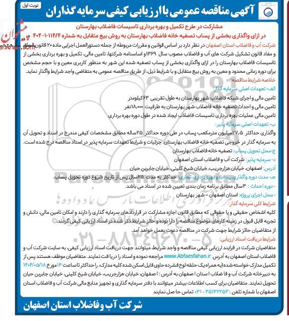 شرکت آب و فاضلاب استان اصفهان در نظر دارد بر اساس قوانین و مقررات مربوطه از جمله دستور العمل اجرایی ماده 20 قانون مفاد قانون تشکیل شرکت های آب و فاضلاب مصوب سال 1369 و اساسنامه شرکتها تامین مالی، تکمیل و بهره برداری بخشی از تاسیسات فاضلاب بهارستان را در ازای واگذاری بخشی از پساب تصفیه شده این شهر به منظور کاربری معین و با حجم مشخص برای دوره زمانی محدود و معین به روش بیع متقابل و با شرایط ذیل، از طریق مناقصه عمومی به متقاضی واجد شرایط واگذار نماید.