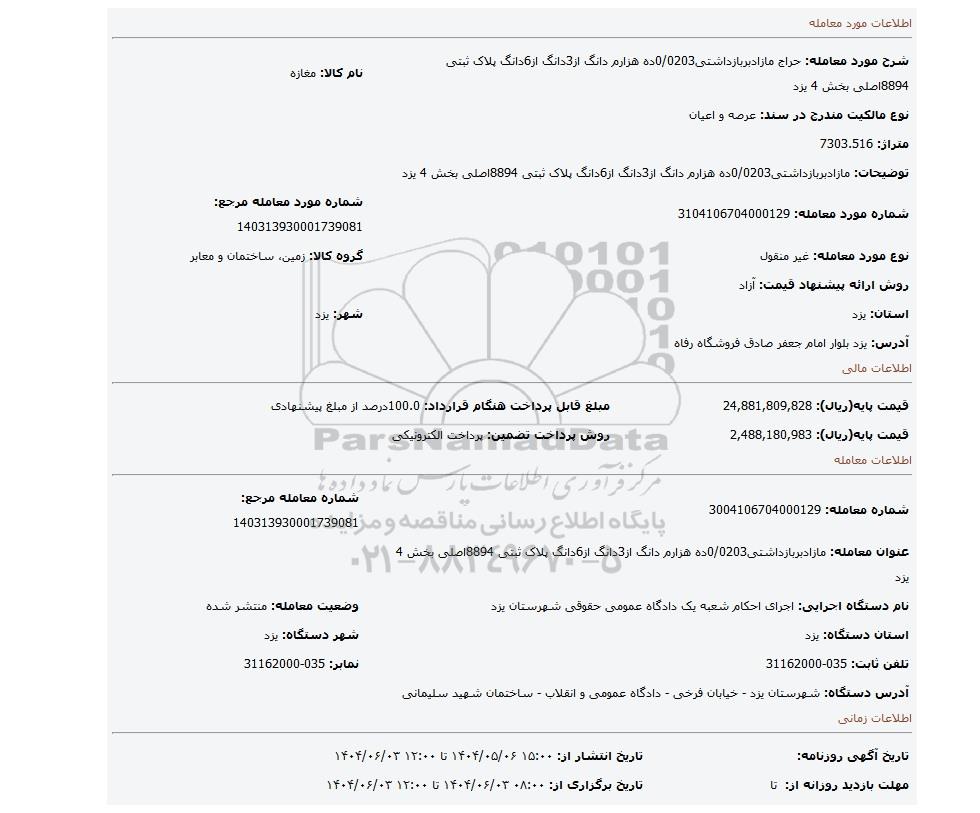 | عنوان معامله: مازادبربازداشتی0/0203ده هزارم دانگ از3دانگ از6دانگ پلاک ثبتی 8894اصلی بخش 4 یزد | ||