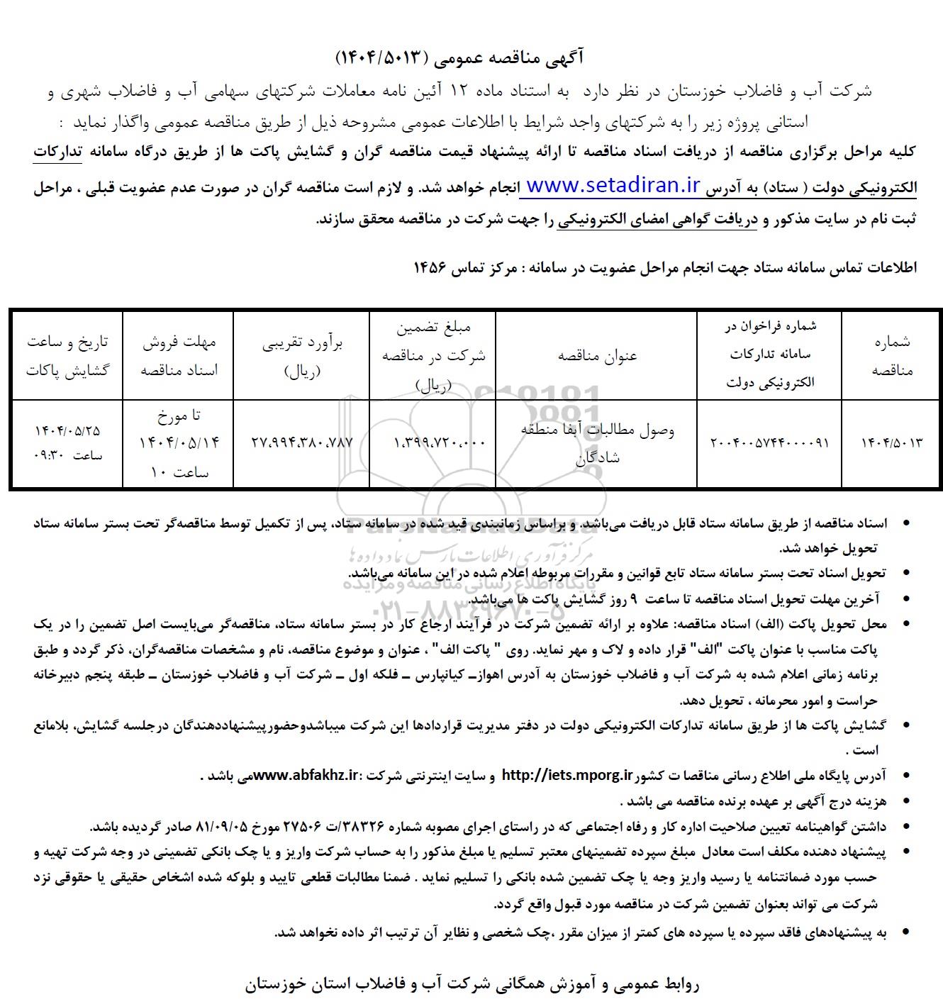 عنوان مناقصه: وصول مطالبات آبفا منطقه شادگان