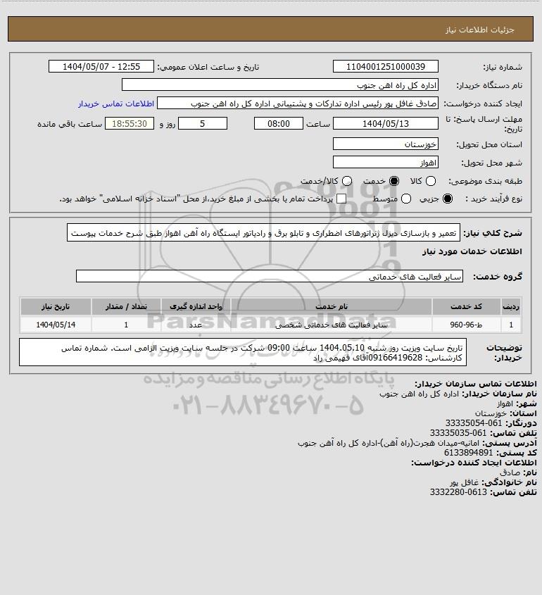 شرح کلی نیاز: تعمیر و بازسازی دیزل ژنراتورهای اضطراری و تابلو برق و رادیاتور ایستگاه راه آهن اهواز طبق شرح خدمات پیوست
