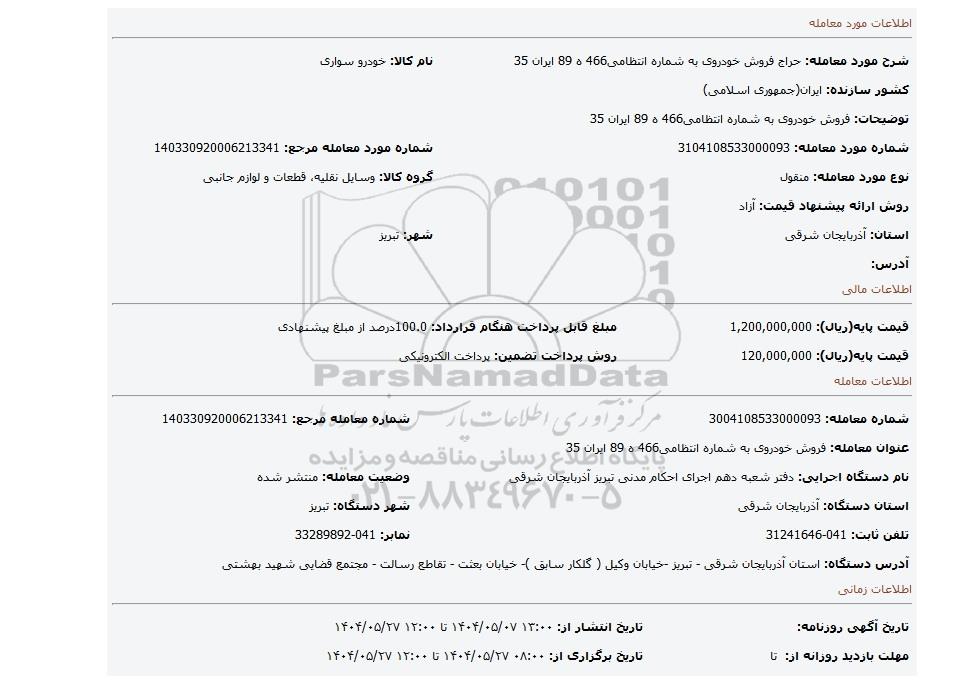 | شرح مورد معامله: حراج فروش خودروی به شماره انتظامی466 ه 89 ایران 35 | نام کالا: خودرو سواری | |