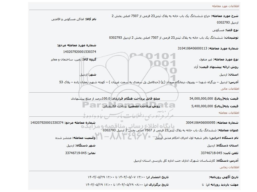 شرح مورد معامله: حراج ششدانگ یک باب خانه به پلاک ثبتی23 فرعی از 7507 اصلی بخش 2 اردبیل 0302793 | نام کالا: اماکن مسکونی و اقامتی | |