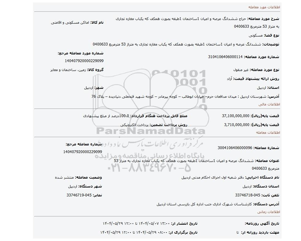 شرح مورد معامله: حراج ششدانگ عرصه و اعیان 1ساختمان 1طبقه بصورت همکف که یکباب مغازه تجاری به متراژ 53 مترمربع 0400633 | نام کالا: اماکن مسکونی و اقامتی | |
