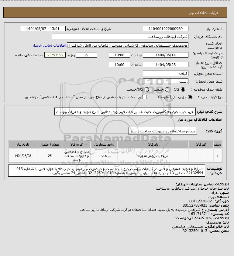 شرح کلی نیاز: خرید درب حوضچه کامپوزیت جهت مسیر های فیبر نوری مطابق شرح ضوابط و مقررات پیوست