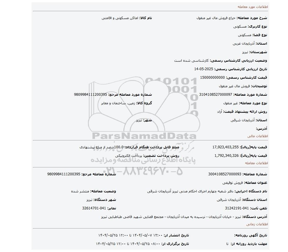| شماره مورد معامله: 3104108527000097 | شماره مورد معامله مرجع: 9809984111200395 | |