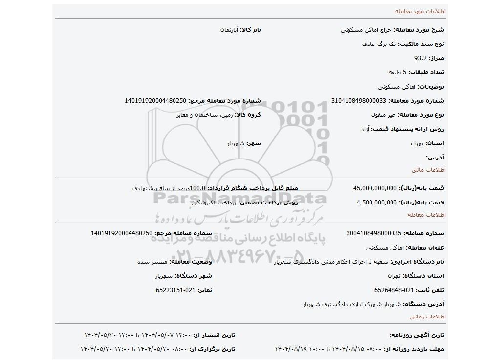 | شرح مورد معامله: حراج اماکن مسکونی | نام کالا: آپارتمان | |