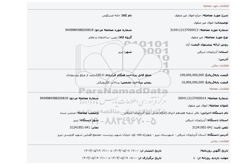 | شماره مورد معامله: 3104112137000013 | شماره مورد معامله مرجع: 9409984588200818 | |