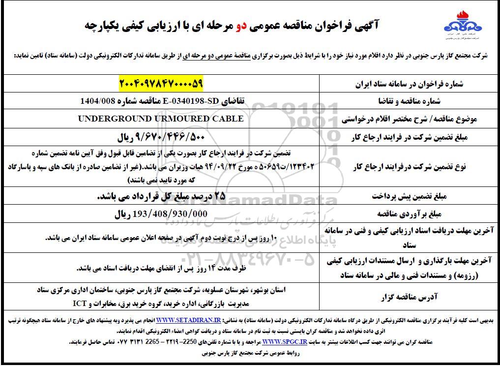 علاقه‌مندان می‌توانند جهت دریافت اسناد و اطلاعات تکمیلی، مناقصه UNDERGROUND URMOURED CABLE با سامانه مناقصات و مزایدات ایران پارس‌نماد داده ها 88349670 تماس حاصل نمایند.