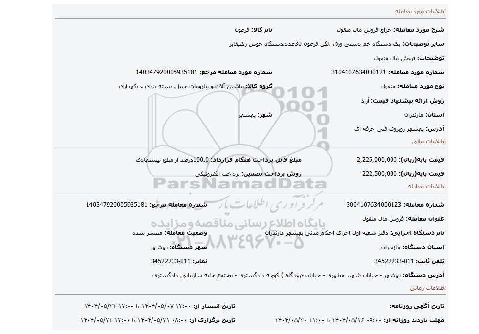 | شرح مورد معامله: حراج فروش مال منقول | نام کالا: فرغون | |