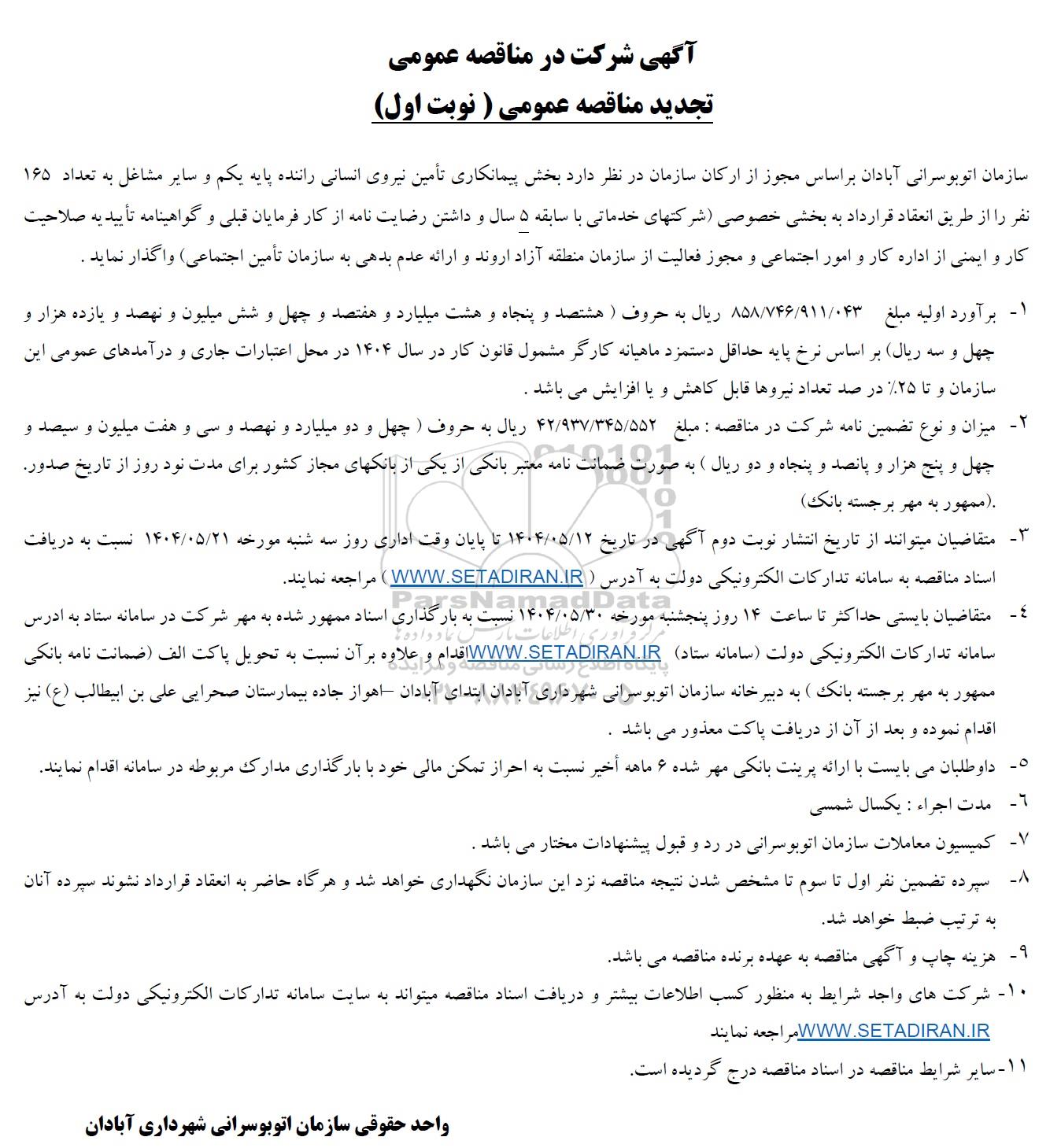 سازمان اتوبوسرانی آبادان بر اساس مجوز از ارکان سازمان در نظر دارد بخش پیمانکاری تأمین نیروی انسانی راننده پایه یکم و سایر مشاغل به تعداد 165 نفر را از طریق انعقاد قرارداد به بخشی خصوصی شرکتهای خدماتی با سابقه 5 سال و داشتن رضایت نامه از کار فرمایان قبلی و گواهینامه تأییدیه صلاحیت کار و ایمنی از اداره کار و امور اجتماعی و مجوز فعالیت از سازمان منطقه آزاد اروند و ارائه عدم بدهی به سازمان تأمین اجتماعی واگذار نماید .