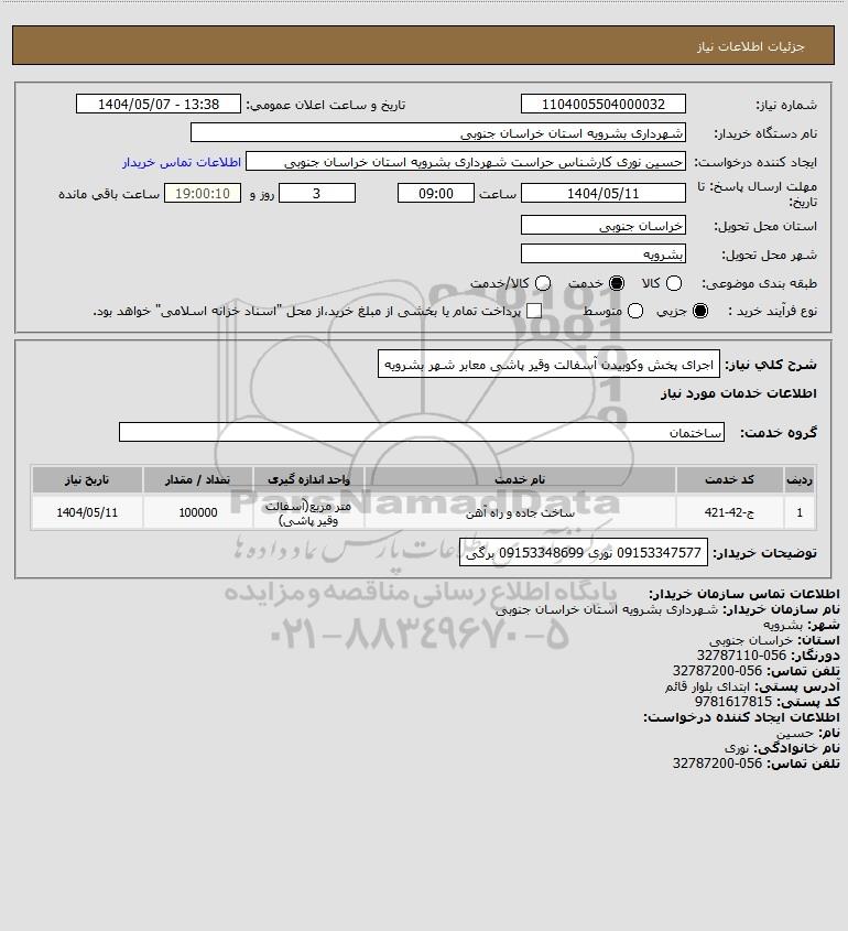 شرح کلی نیاز: اجرای پخش وکوبیدن آسفالت وقیر پاشی معابر شهر بشرویه