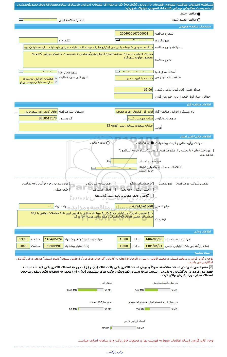 | عنوان/موضوع مناقصه | مناقصه عمومی همزمان با ارزیابی (یکپارچه) یک مرحله ای عملیات اجرایی بازسازی سازه،معماری(دیوارچینی)وبخشی از تاسیسات مکانیکی وبرقی کتابخانه عمومی مولوی شهرکرد | ||