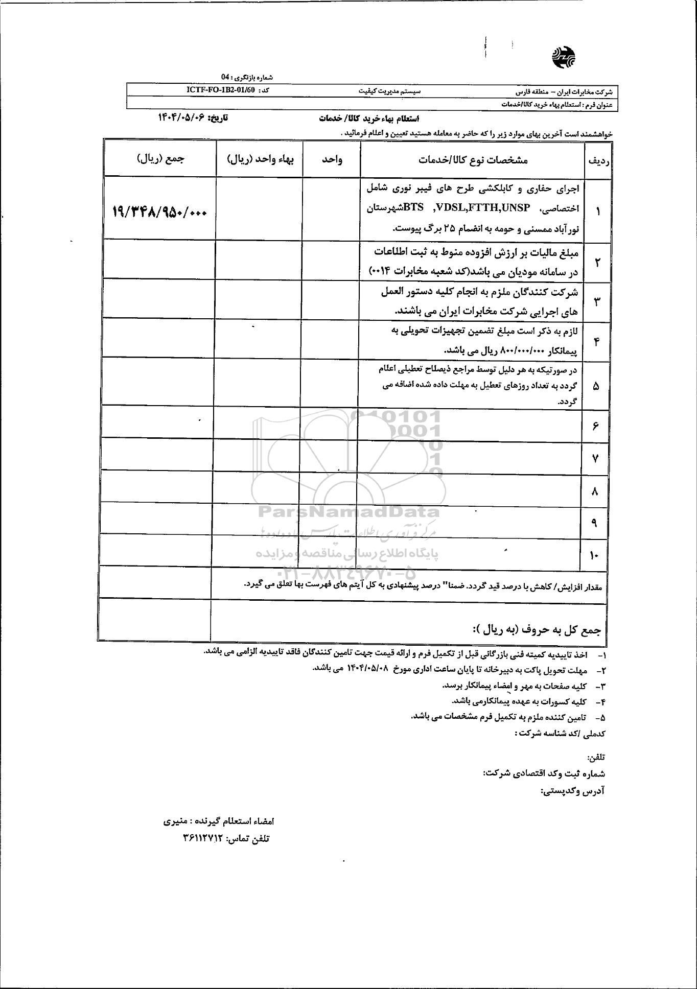 استعلام بها و موضوع استعلام استعلام اجرای حفاری و کابلکشی طرح های فیبر نوری شامل اختصاصی BTS، VDSL FTTH, UNSP به اطلاع کلیه شرکتها و افراد متخصص واجد شرایط میرساند، آگهی گذار در نظر دارد از طریق استعلام بها، نسبت به انتخاب و دریافت پیشنهادات اقدام نماید. این استعلام با کد آگهی ثبت شده در سامانه خبرگزاری پارس نماد : 9340464 منتشر شده است. مشخصات استعلام : تاریخ شروع استعلام: 1404/05/07 آخرین مهلت ارسال پیشنهاد قیمت : 1404/05/08 و محل اجرای پروژه : استان فارس میباشد. استعلام قیمت مورد درخواست : استعلام اجرای حفاری و کابلکشی طرح های فیبر نوری شامل اختصاصی BTS، VDSL FTTH, UNSP با دستهبندیهای تخصصی و گروه های مرتبط : پیمانکاری مخابرات, حفاری و حفر چاه آب, استعلام اطلاع رسانی میگردد.