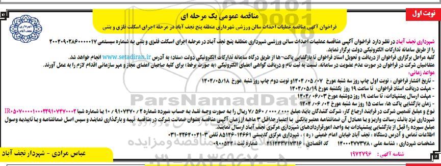 شهرداری نجف آباد در نظر دارد فراخوان آگهی احداث سالن ورزشی شهرداری منطقه پنج نجف آباد در مرحله اجرای اسکلت فلزی و بتنی به شماره سیستمی 20040902860000017 را از طریق سامانه تدارکات الکترونیکی دولت برگزار نماید.