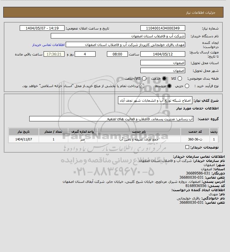 شرح کلی نیاز: اصلاح شبکه توزیع آب و انشعابات شهر نجف آباد