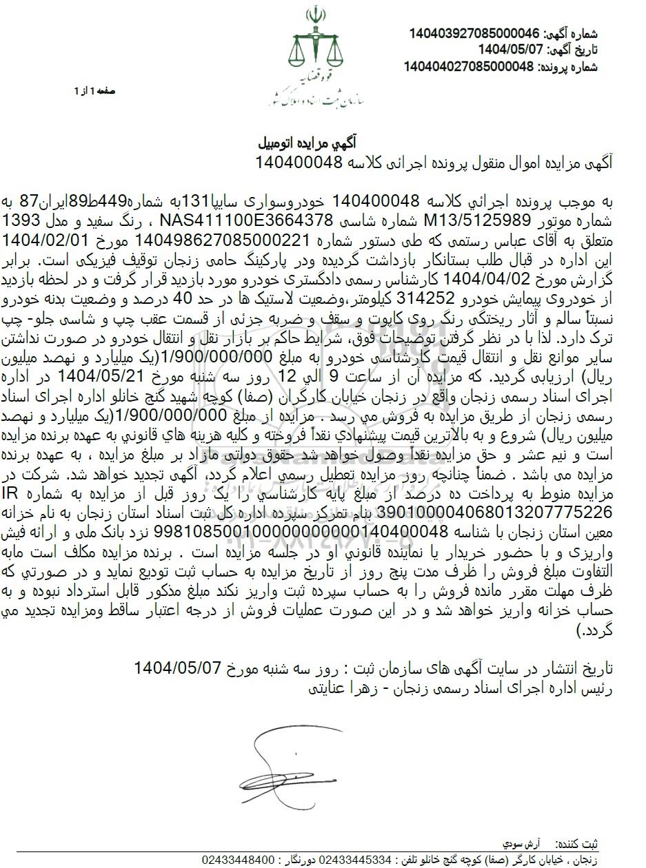 مزایده خودرو سواری سایپا 131 مدل 1393 , مزایده خودرو سواری سایپا 131 مدل 1393