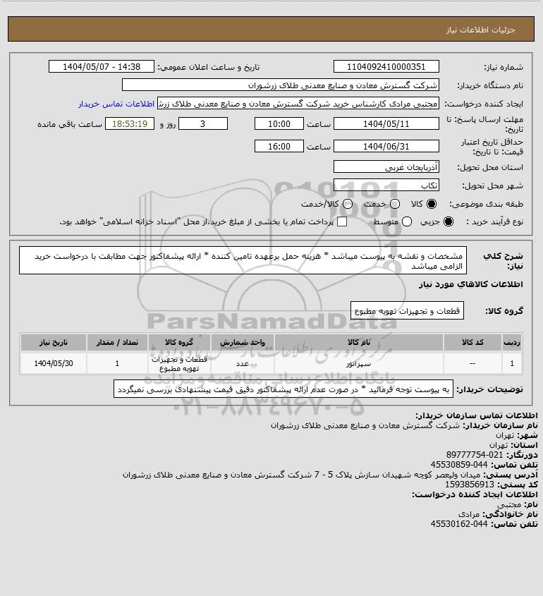 نام دستگاه خریدار:شرکت گسترش معادن و صنایع معدنی طلای زرشوران