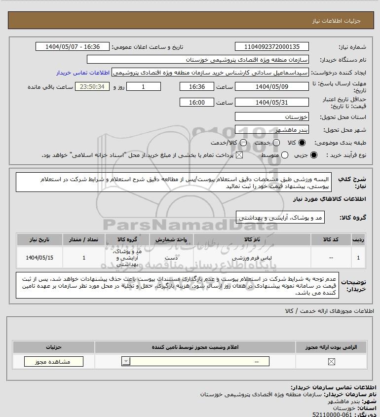 شرح کلی نیاز: البسه ورزشی طبق مشخصات دقیق استعلام پیوست/پس از مطالعه دقیق شرح استعلام و شرایط شرکت در استعلام پیوستی، پیشنهاد قیمت خود را ثبت نمائید
