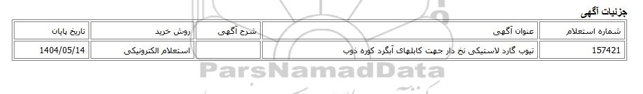 | 157421 | تیوب گارد لاستیکی نخ دار جهت کابلهای آبگرد کوره ذوب | استعلام الکترونیکی | 1404/05/14 |