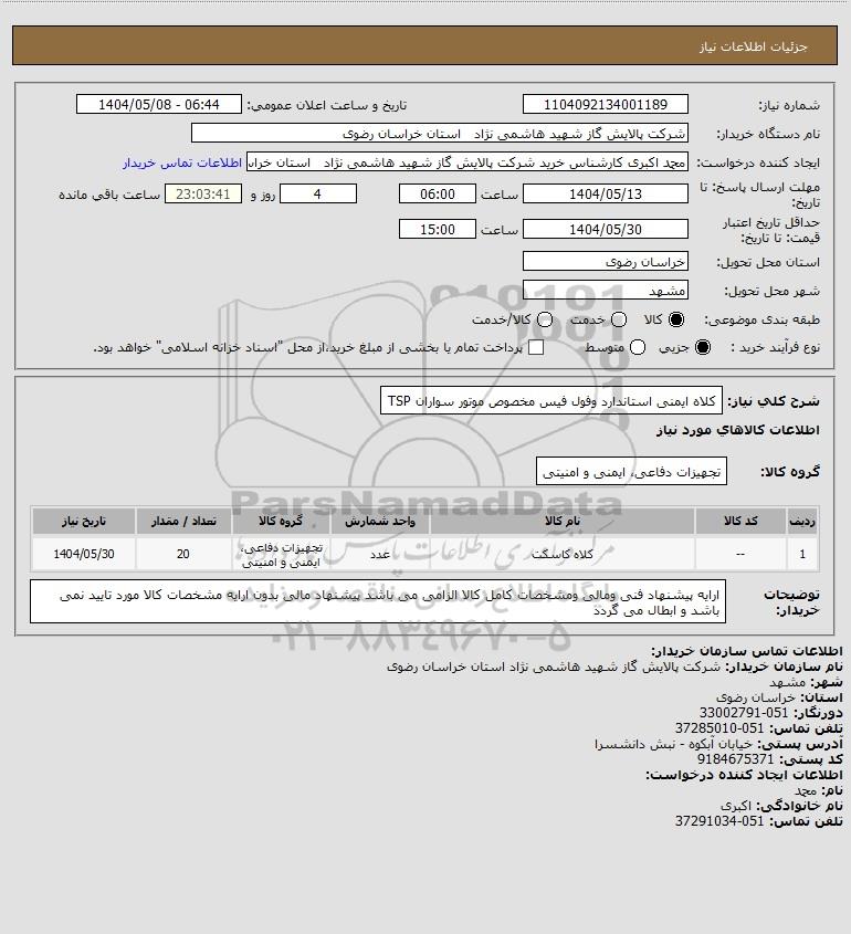 نام دستگاه خریدار:شرکت پالایش گاز شهید هاشمی نژاد استان خراسان رضوی