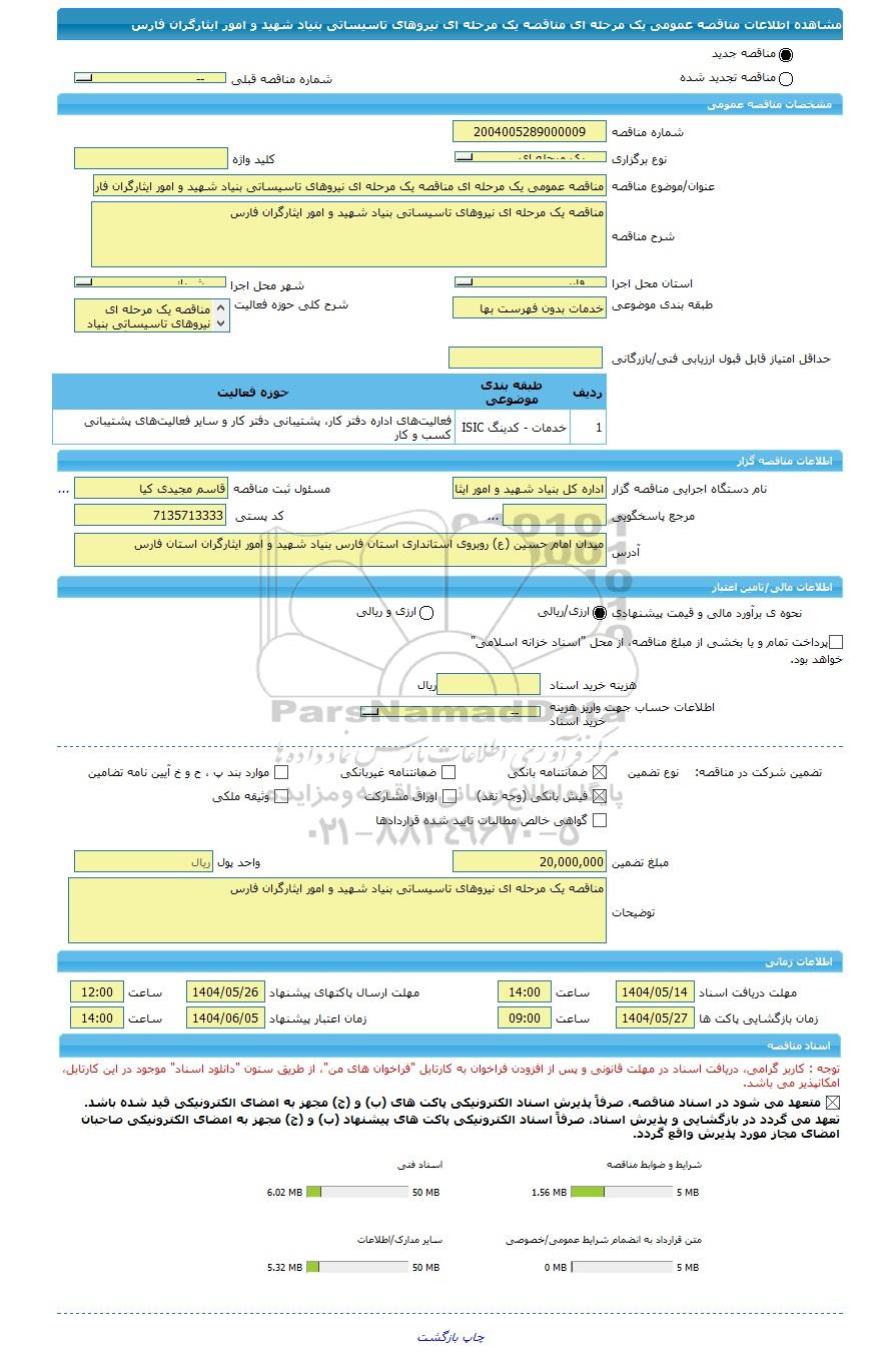 مناقصه مناقصه عمومی یک مرحله ای مناقصه یک مرحله ای نیروهای تاسیساتی بنیاد شهید و امور ایثارگران فارس, مناقصه، مناقصه عمومی یک مرحله ای مناقصه یک مرحله ای نیروهای تاسیساتی بنیاد شهید و امور ایثارگران فارس