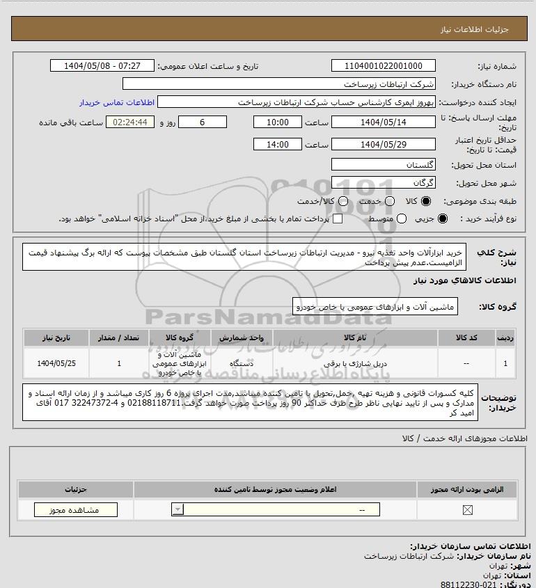 شرح کلی نیاز: خرید ابزارآلات واحد تغذیه نیرو - مدیریت ارتباطات زیرساخت استان گلستان طبق مشخصات پیوست که ارائه برگ پیشنهاد قیمت الزامیست.عدم پیش پرداخت